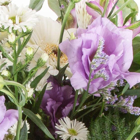A crisp looking hand-tied bouquet of white and lilac blooms mixed with delicate foliage.